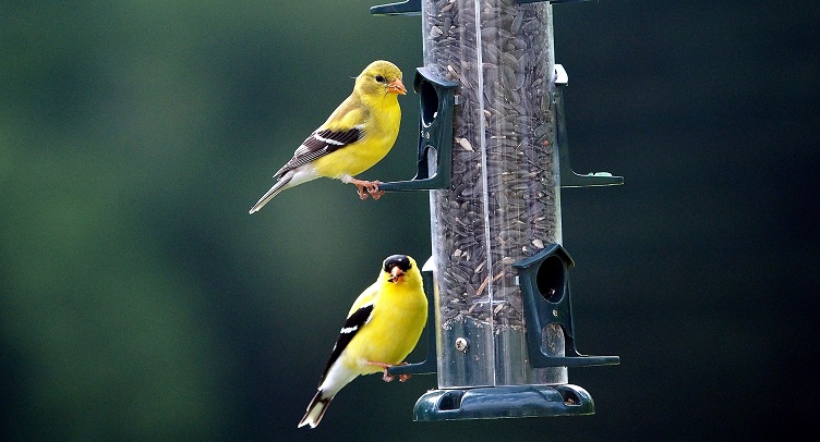 The American Goldfinch is a tiny little birdie, with bright yellow colors. Male and female look a lot like each other but the female (on top) is a bit duller. The male (on bottom) is much brighter and has the black hat and face. high-res