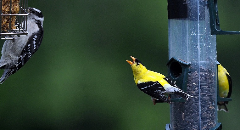 American Goldfinches are extremely combative, they are constantly fighting. This one is even threatening the Downy Woodpecker next door, but he's being ignored. high-res